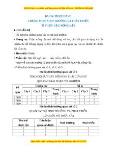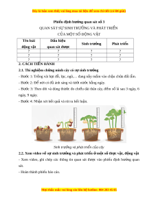 ấ (thìa xúc), găng tay cao su, thư c ớ đo chi u ề dài c a ủ cây. + Hóa ch t ấ : Nư c. ớ + Mẫu v t ậ : H t ạ đỗ, ngô, l c,… ạ n y m ả m ầ , đ t ấ m ẩ . - Video v s ề ự sinh trư ng và phát ở tri n c ể a ủ m t ộ s t ố h c v ự t ậ , đ ng v ộ t ậ . - Phi u đ ế nh h ị ư ng quan s ớ át số 1, số 2, số 3. Phi u đ ế nh h ị ư ng quan s ớ át s 1 ố THEO DÕI S Ự THAY Đ I Ổ HÌNH THÁI C A Ủ CÂY QUA CÁC GIAI ĐO N Ạ THÍ NGHI M Ệ Chi u cao ề Số lá Số Trung Trung ngày Cây 1 Cây 2 Cây 3 Cây 1 Cây 2 Cây 3 bình bình 3 ngày ? ? ? ? ? ? ? ? 6 ngày ? ? ? ? ? ? ? ? 9 ngày ? ? ? ? ? ? ? ? Phi u đ ế nh h ị ư ng quan s ớ át s 2 ố QUAN SÁT S S Ự INH TR N ƯỞ G VÀ PHÁT TRI N Ể CỦA MỘT SỐ TH C Ự V T Ậ Tên loài Dấu hi u ệ Sinh trư ng ở Phát tri n ể thực vật quan sát đư c ợ ? ? ? ? ? ? ? ? ? ? ? ? M i