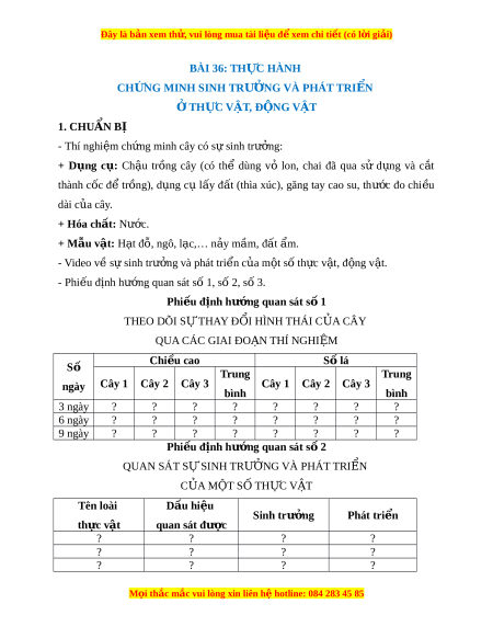 Đây là bản xem th , vu ử i lòng mua tài li u ệ đ xe ể m chi ti t (c ế ó l i ờ gi i ả ) Phi u đ ế nh h ị ư ng quan s ớ át s 3 ố QUAN SÁT S S Ự INH TR N ƯỞ G VÀ PHÁT TRI N Ể CỦA MỘT SỐ ĐỘNG V T Ậ Tên loài Dấu hi u ệ Sinh trư ng ở Phát tri n ể đ ng v ộ ật quan sát đư c ợ ? ? ? ? ? ? ? ? ? ? ? ? 2. CÁCH TI N Ế HÀNH 2.1. Thí nghi m ệ ch ng m ứ inh cây có s s ự inh trư ng ở - Bư c ớ 1: Trồng vài h t ạ đỗ, l c, ạ ngô,… đang n y m ả m ầ vào ch u ậ ch a đ ứ t ấ m ẩ . - Bư c ớ 2: Đ n ể i