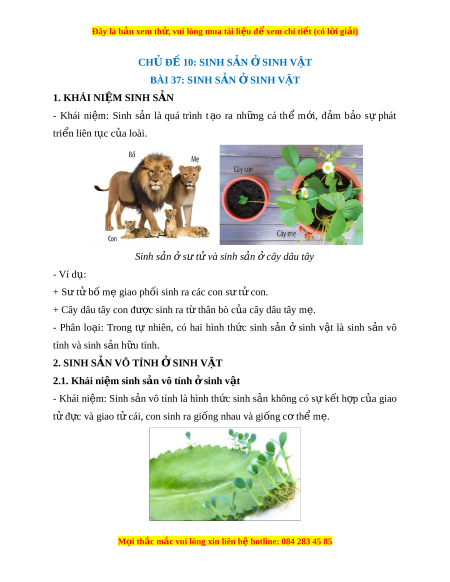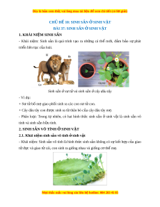 Đây là bản xem th , vu ử i lòng mua tài li u ệ đ xe ể m chi ti t (c ế ó l i ờ gi i ả ) CH Đ Ủ Ề 10: SINH S N Ả SI Ở NH V T Ậ BÀI 37: SINH SẢN SI Ở NH V T Ậ 1. KHÁI NI M SI Ệ NH S N Ả - Khai ni m ê : Sinh s n ả la qua trinh t o a ra nh ng ư ca th ê m i ơ , đ m ả b o ả s ư phat tri n l ê iên t c c u a u loai. Sinh s n ả s ở t ư và s ử inh s n ả cây dâu t ở ây - Ví d : u + S t
