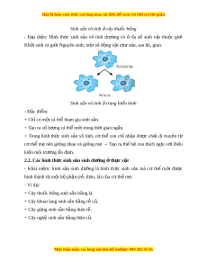 ả vô tính, cơ thê con chi nh n ậ đư c ơ ch t ấ di truy n ề tư cơ thê me nên gi ng ô nhau va gi ng ô m e → T o a ra th ế h ê con thích nghi v i ơ đi u ề kiên môi trư ng ờ n đ ô nh. i 2.2. Các hình th c s ứ inh s n s ả inh dư ng ỡ t ở h c v ự t ậ - Khai ni m ê : Sinh s n ả sinh dư ng ơ la hinh th c ứ sinh s n ả ma cơ th ê m i ơ đư c ơ hinh thanh t m ư t ộ b ph ộ n ( ậ r , t ê hân, la) c a u c t ơ h m ê . e - Ví d : u + Cây thu c ô b ng s o inh s n b ả ng ă la. + Cây khoai lang sinh s n b ả ng ă r c ê . u + Cây g ng s ư inh s n b ả ng ă thân r . ê + Cây ngh s ê inh s n b ả ng ă thân c . u M i