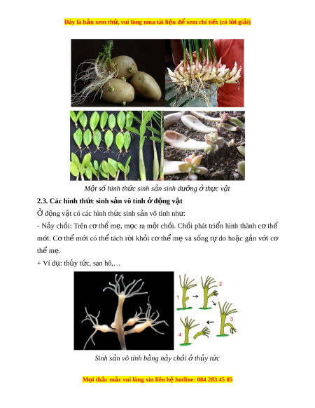 Đây là bản xem th , vu ử i lòng mua tài li u ệ đ xe ể m chi ti t (c ế ó l i ờ gi i ả ) M t ộ số hình th c s ứ inh s n ả sinh dư ng ỡ t ở h c v ự t ậ 2.3. Các hình th c s ứ inh s n vô t ả ính đ ở ng v ộ t ậ Ở đ ng v ộ t ậ có cac hinh th c ứ sinh s n ả vô tính nh : ư - N y ả ch i ô : Trên cơ th ê m , e m c o ra m t ộ ch i ô . Ch i ô phat tri n ê hinh thanh c ơ thê m i ơ . Cơ th ê m i ơ có th ê tach r i ờ kh i o cơ th ê m e va s ng ô t ư do ho c ă g n ă v i ơ cơ th m ê . e + Ví d : u th y t u c, s ứ an hô,… Sinh s n vô t ả ính b ng ă n y ch ả ôi ở th y ủ t c ứ M i