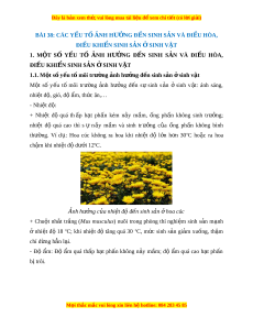 Đây là bản xem th , vu ử i lòng mua tài li u ệ đ xe ể m chi ti t (c ế ó l i ờ gi i ả ) BÀI 38: CÁC Y U Ế TỐ N Ả H HƯ N Ở G Đ N Ế SINH S N Ả VÀ ĐI U Ề HÒA, ĐIỀU KHI N Ể SINH S N Ả SI Ở NH V T Ậ 1. M T Ộ SỐ Y U Ế TỐ N Ả H HƯ N Ở G Đ N Ế SINH S N Ả VÀ ĐI U Ề HÒA, ĐIỀU KHI N Ể SINH S N Ả SI Ở NH V T Ậ 1.1. M t ộ s y ố u t ế m ố ôi trư ng ờ nh h ả ư ng đ ở n s ế inh s n ả s ở inh v t ậ M t ô sô y u ê t ô môi trư ng ơ nh a hư ng ơ đ n ê s ư sinh s n a ơ sinh v t â : anh sang, nhiêt đ , gi ô o, đ ô m â , th c ăn,… ư - Nhiêt đ : ô + Nhi t ê đ ô qua th p â h t a ph n â kem n y a m m â , ng ô ph n â không sinh trư ng; ơ nhiêt đ ô qua cao thi s ư n y a m m â va sinh trư ng ơ c a u ng ô ph n â không binh thư ng. ơ Vi d :