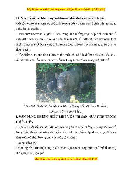 Đây là bản xem th , vu ử i lòng mua tài li u ệ đ xe ể m chi ti t (c ế ó l i ờ gi i ả ) 1.2. M t ộ s y ố u t ế bên t ố rong nh h ả ư ng đ ở n s ế inh s n c ả a s u inh v t ậ M t ô sô y u ê t ô bên trong c ơ th ể nh a hư ng ơ đ n ê s ư sinh s n a ơ sinh v t â : hormone sinh s n, a di truy n,… ê - Hormone: Hormone la y u ê tô bên trong nh a hư ng ơ tr c ư ti p ê đ n ê sinh s n a ơ sinh v t â , tham gia đi u ê hoa sinh s n a ơ sinh v t â . Ở th c ư v t â , co hormone kich thich sư nơ hoa. Ở đ ng ô v t â , co hormone đi u ê khi n ể s ư phat sinh giao t ử đ c ư va giao t cai ử . - Đ c ặ đi m ể di truy n ê (loai): Tùy thu c ô m i ô loai co đ c ặ đi m ể sinh s n a khac nhau v đ ê t ô uôi sinh s n, a mùa v s u inh s n va t a rung binh s con t ô rong m t ô l a đ ư . ẻ L n c ợ ỏ A Lư i ớ đ l