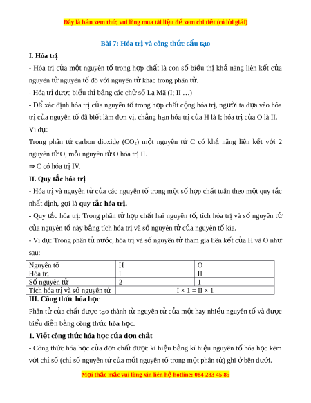 ích hóa trị và số nguyên t c ử a ủ nguyên tố kia. - Ví d : ụ Trong phân t n ử ư c, hóa ớ tr và s ị nguyên t ố t ử ham gia liên k t ế c a H ủ và O như sau: Nguyên tố H O Hóa trị I II Số nguyên tử 2 1 Tích hóa tr và s ị ố nguyên tử I × 1 = II × 1 III. Công th c hóa h ứ c ọ Phân tử c a ủ ch t ấ đư c ợ t o ạ thành t ừ nguyên t ử c a ủ m t ộ hay nhi u ề nguyên t ố và đư c ợ bi u di ể n b ễ ng