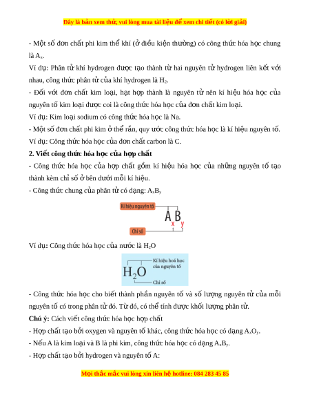 ợ thành là nguyên tử nên kí hi u ệ hóa h c ọ c a ủ nguyên tố kim lo i ạ đư c ợ coi là công th c hóa ứ h c c ọ a đ ủ n ơ ch t ấ kim lo i ạ . Ví d : ụ Kim lo i ạ sodium có công th c ứ hóa h c l ọ à Na. - M t ộ số đ n ch ơ ất phi kim t ở h r ể n, quy ắ ư c ớ công th c hóa h ứ c ọ là kí hi u nguyên t ệ . ố Ví d : ụ Công th c hóa h ứ c ọ c a đ ủ n ch ơ t ấ carbon là C. 2. Vi t ế công th c ứ hóa h c ọ c a h ủ p ch ợ t ấ - Công th c ứ hóa h c ọ c a ủ h p ợ ch t ấ g m ồ kí hi u ệ hóa h c ọ c a ủ nh ng ữ nguyên tố t o ạ thành kèm chỉ số bên d ở ư i ớ mỗi kí hi u. ệ - Công th c ứ chung c a phân t ủ có ử d ng: ạ AxBy
