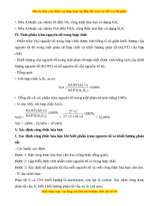 ầ trăm (%) nguyên tố trong h p ợ ch t ấ đư c ợ tính b ng ằ t ỉs ố gi a ữ kh i ố lư ng ợ c a ủ nguyên tố đó trong m t ộ phân tử h p ợ ch t ấ và kh i ố lư ng ợ phân tử (KLPT) c a ủ h p ợ chất. - Kh i ố lư ng ợ c a ủ nguyên t ố trong m t ộ phân t ử h p ợ ch t ấ đư c ợ tính b ng ằ tích c a ủ kh i ố lư ng ợ nguyên t ( ử KLNT) và số nguyên t c ử a nguyên t ủ đó. ố - Tổng quát: + V i ớ h p ch ợ t ấ AxBy, ta có: KLNT(A) x %A 100% KLPT(A B ) x y + Tổng t t ấ c các ả ph n t ầ răm nguyên t t ố rong m t ộ phân tử luôn b ng ằ 100%. - Ví d : ụ Đối v i ớ h p ch ợ t ấ Al2O3 KLNT(Al) 2 1 27 2 00% 1 00% %Al = KLPT(Al O ) 2 3 = 27 2 16 3 = 52,94% %O = 100% - 52,94% = 47,06% V. Xác đ nh công t ị h c ứ hóa h c ọ 1. Xác đ nh ị công th c ứ hóa h c ọ khi bi t ế ph n ầ trăm nguyên t ố và kh i ố lư ng ợ phân t : ử - Các bư c xác ớ đ nh: ị Bư c 1: ớ Đ t ặ công th c hóa h ứ c ọ c n t ầ ìm (công th c t ứ ng quát ổ ); Bư c 2: ớ L p bi ậ u t ể h c ứ tính ph n t ầ răm nguyên t có ố trong h p ch ợ t ấ ; Bư c 3: ớ Xác đ nh s ị ố nguyên t c ử a m ủ ỗi nguyên tố và vi t ế công th c hóa h ứ c ọ c n t ầ ìm. - Ví dụ minh h a: ọ Phân tử X có 75% kh i ố lư ng ợ là aluminium, còn l i ạ là carbon. Xác đ nh ị công th c ứ phân tử c a X ủ , bi t ế khối lư ng phân t ợ c ử a ủ nó là 144 amu. M i