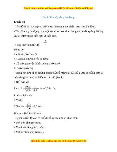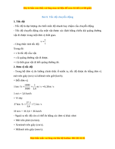 Đây là bản xem th , vu ử i lòng mua tài li u ệ đ xe ể m chi ti t (c ế ó l i ờ gi i ả ) Bài 8. T c đ ố ộ chuy n đ ể ng ộ 1. T c ố độ - Tốc đ l ộ à đ i ạ lư ng ợ cho bi t ế m c đ ứ nhanh ộ hay ch m ậ c a ủ chuy n đ ể ng. ộ - T c ố độ chuy n ể đ ng ộ c a ủ m t ộ v t ậ đư c ợ xác đ nh ị b ng ằ chi u ề dài quãng đư ng ờ v t ậ đi đư c t ợ rong m t ộ đ n v ơ t ị h i ờ gian. s v - Công th c ứ tính t c đ ố : ộ t Trong đó: + v là tốc đ c ộ a ủ v t ậ . + s là quãng đư ng v ờ t ậ đi đư c. ợ + t là th i ờ gian v t ậ đi h t ế quãng đư ng đó. ờ 2. Đ n ơ v t ị c đ ố ộ - Trong hệ đ n ơ vị đo lư ng ờ chính th c ứ ở nư c ớ ta, t c ố độ đư c ợ đo b ng ằ đ n ơ vị