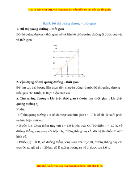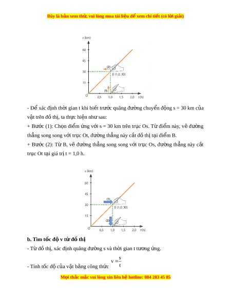 Đây là bản xem th , vu ử i lòng mua tài li u ệ đ xe ể m chi ti t (c ế ó l i ờ gi i ả ) - Đ xác đ ể ịnh th i ờ gian t khi bi t ế trư c quãng đ ớ ư ng ờ chuy n đ ể ng s ộ = 30 km c a ủ v t ậ trên đồ th , t ị a th c hi ự n nh ệ s ư au: + Bư c ớ (1): Ch n ọ đi m ể ng ứ v i ớ s = 30 km trên tr c ụ Os. T ừ đi m ể này, v ẽ đư ng ờ th ng ẳ song song v i ớ tr c ụ Ot, đư ng t ờ h ng ẳ này c t ắ đ t ồ h t ị i ạ đi m ể B. + Bư c ớ (2): Từ B, vẽ đư ng ờ th ng ẳ song song v i ớ tr c ụ Os, đư ng ờ th ng ẳ này c t ắ tr c O ụ t t i ạ giá tr t ị = 1,0 h. b. Tìm t c đ ố v t ộ đ ừ ồ thị - T đ ừ ồ th , xác ị đ nh quãng ị đư ng s ờ và th i ờ gian t tư ng ơ ng. ứ s v - Tính tốc đ c ộ a ủ v t ậ b ng công t ằ h c ứ t M i