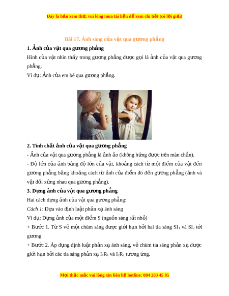 Bài 17. Ánh sáng c a v ủ t ậ qua gư ng ơ ph ng ẳ 1. Ảnh c a v ủ t ậ qua gư ng ph ơ ng ẳ Hình c a ủ v t ậ nhìn th y ấ trong gư ng ơ ph ng ẳ đư c ợ g i ọ là nh ả c a ủ v t ậ qua gư ng ơ ph ng. ẳ Ví d : ụ nh c Ả a ủ em bé qua gư ng ơ ph ng. ẳ 2. Tính ch t ấ nh c ả a v ủ t ậ qua gư ng ph ơ ng ẳ - nh c Ả a v ủ t ậ qua gư ng ph ơ ng ẳ là nh ả o ( ả không h ng đ ứ ư c t ợ rên màn ch n) ắ . - Độ l n ớ c a ủ nh ả b ng ằ độ l n ớ c a ủ v t ậ , kho ng ả cách từ m t ộ đi m ể c a ủ v t ậ đ n ế gư ng ơ ph ng ẳ b ng ằ kho ng ả cách t ừ nh ả c a ủ đi m ể đó đ n ế gư ng ơ ph ng ẳ ( nh ả và v t ậ đối x ng nhau ứ qua gư ng ph ơ ng) ẳ . 3. Dựng ảnh c a v ủ t ậ qua gư ng ph ơ ng ẳ Hai cách d ng ự nh ả c a v ủ t ậ qua gư ng ph ơ ng: ẳ Cách 1: D a vào đ ự nh l ị u t ậ ph n ả x ánh ạ sáng Ví d : ụ D ng ự nh c ả a ủ m t ộ đi m ể S (ngu n s ồ áng r t ấ nh ) ỏ + Bư c ớ 1. Từ S vẽ m t ộ chùm sáng đư c ợ gi i ớ h n ạ b i