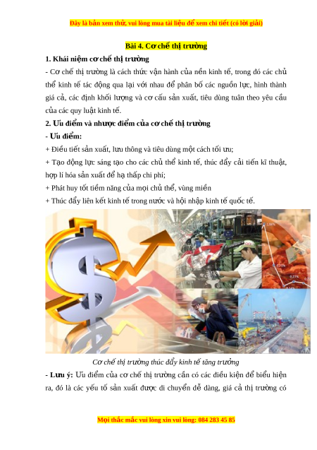 Đây là bản xem th , vu ử i lòng mua tài li u ệ đ xe ể m chi ti t ế (có l i ờ gi i ả ) Bài 4. Cơ ch t ế h t ị rư ng ờ 1. Khái ni m ệ c ch ơ ế th t ị rư ng ờ - Cơ chế thị trư ng ờ là cách th c ứ v n ậ hành c a ủ n n ề kinh t , ế trong đó các chủ thể kinh tế tác đ ng ộ qua l i ạ v i