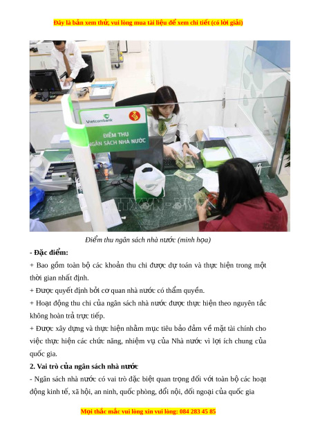 ể thu ngân sách nhà nư c ( ớ minh h a) ọ - Đặc đi m ể : + Bao g m ồ toàn bộ các kho n ả thu chi đư c ợ dự toán và th c ự hi n ệ trong m t ộ th i ờ gian nh t ấ đ nh. ị + Đư c ợ quy t ế đ nh b ị i ở c quan nhà ơ nư c có t ớ h m ẩ quy n. ề + Ho t ạ đ ng ộ thu chi c a ủ ngân sách nhà nư c ớ đư c ợ th c ự hi n ệ theo nguyên t c ắ không hoàn tr t ả r c t ự i p. ế + Đư c ợ xây d ng ự và th c ự hi n ệ nh m ằ m c ụ tiêu b o ả đ m ả v ề m t ặ tài chính cho việc th c ự hi n ệ các ch c ứ năng, nhi m ệ vụ c a ủ Nhà nư c ớ vì l i ợ ích chung c a ủ quốc gia. 2. Vai trò c a n ủ gân sách nhà nư c ớ - Ngân sách nhà nư c ớ có vai trò đ c ặ bi t ệ quan tr ng ọ đ i ố v i ớ toàn b ộ các ho t ạ đ ng ộ kinh t , ế xã h i ộ , an ninh, qu c phòng, đ ố i ổ n i ộ , đ i ố ngo i ạ c a qu ủ c gi ố a M i ọ thắc m c