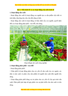 Đây là bản xem th , vu ử i lòng mua tài li u ệ đ xe ể m chi ti t ế (có l i ờ gi i ả ) Bài 1. N n k ề inh t và các ho ế t ạ đ ng c ộ a n ủ n ki ề nh tế 1. Hoạt đ ng s ộ n xu ả t ấ - Ho t ạ đ ng ộ s n ả xu t ấ là ho t ạ đ ng ộ con ngư i ờ t o ạ ra s n ả ph m ẩ v t ậ ch t ấ và tinh th n, đáp ầ ng ứ nhu c u c ầ a đ ủ i ờ s ng xã ố h i ộ . - Ho t ạ đ ng ộ s n ả xu t ấ là ho t ạ đ ng ộ cơ b n ả nh t ấ c a ủ con ngư i ờ , quy t ế đ nh ị đ n các ho ế t ạ đ ng phân ph ộ ối - trao đ i ổ , tiêu dùng. Ho t ạ đôngk s n ả xu t ấ nông nghi p ệ 2. Hoạt đ ng phân p ộ h i ố - trao đ i ổ - Ho t ạ đ ng phân ph ộ ối: + Phân ph i ố là ho t ạ đ ng ộ phân chia các y u ế tố s n ả xu t ấ cho các ngành, các đ n ơ vị s n ả xu t ấ và phân chia s n ả ph m ẩ từ ngư i ờ s n ả xu t ấ đ n ế ngư i ờ tiêu dùng. + Ho t ạ đ ng ộ phân ph i