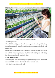 Đây là bản xem th , vu ử i lòng mua tài li u ệ đ xe ể m chi ti t (c ế ó l i ờ gi i ả ) Ho t ạ đ ng ộ phân phối s n ph ả m ẩ s a ữ - Ho t ạ đ ng ộ trao đ i ổ : + Trao đ i ổ là ho t ạ đ ng ộ nhà s n ả xu t ấ đ a ư s n ả ph m ẩ đ n ế v i ớ ngư i ờ tiêu dùng. Ho t ạ đ ng ộ phân ph i ố - trao đ i ổ th c ự hi n ệ vai trò trung gian, k t ế n i ố s n ả xu t ấ v i ớ tiêu dùng. + Ho t ạ đ ng ộ trao đ i ổ đóng vai trò k t ế n i ố s n ả xu t ấ v i ớ tiêu dùng, giúp ngư i ờ s n ả xu t ấ bán đư c ợ s n ả ph m ẩ , duy trì, phát tri n ể ho t ạ đ ng ộ s n ả xu t ấ và đáp ng nhu c ứ ầu mua s m ắ c a ủ ngư i ờ tiêu dùng. 3. Hoạt đ ng t ộ iêu dùng - Ho t ạ đ ng ộ tiêu dùng là ho t ạ đ ng ộ con ngư i ờ sử d ng ụ các s n ả ph m ẩ đư c ợ s n xu ả ất đ t ể h a m ỏ ãn nhu c u v ầ t ậ ch t ấ và tinh th n c ầ a ủ mình. - Tiêu dùng là m c đí ụ ch c a ủ s n ả xu t ấ . M i ọ thắc m c