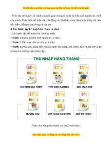 ạ tài chính cá nhân giúp chúng ta qu n ả lý hi u ệ qu ả ngu n ồ tài chính c a ủ mình, đ ng ồ th i ờ thể hi n ệ s ự ch ủ đ ng ộ và c n ẩ th n ậ trong t ng ừ ho t ạ đ ng ộ chi tiêu, ti t ế ki m ệ , đ u t ầ , d ư phòng và vay n ự . ợ 4. Các bư c ớ l p k ậ ho ế ch t ạ ài chính cá nhân - Các bư c l ớ p ậ k ho ế ch t ạ ài chính cá nhân: + Bư c