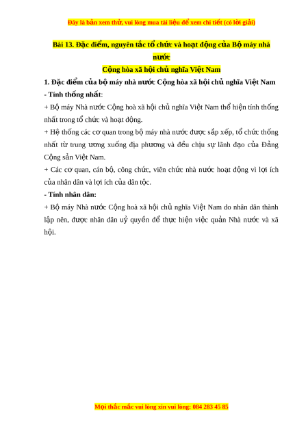 Đây là bản xem th , vu ử i lòng mua tài li u ệ đ xe ể m chi ti t ế (có l i ờ gi i ả ) Bài 13. Đặc đi m ể , nguyên t c t ắ ch ổ c và ho ứ t ạ đ ng c ộ a B ủ m ộ áy nhà nư c ớ C ng hòa xã h ộ i ộ ch ngh ủ ĩa Vi t ệ Nam 1. Đặc đi m ể c a b ủ m ộ áy nhà nư c ớ C ng hòa xã h ộ i ộ ch ngh ủ ĩa Vi t ệ Nam - Tính th ng ố nh t ấ : + Bộ máy Nhà nư c ớ C ng ộ hoà xã h i ộ ch ủ nghĩa Vi t ệ Nam th ể hi n ệ tính th ng ố nh t ấ trong tổ ch c và ho ứ t ạ đ ng. ộ + Hệ th ng ố các cơ quan trong b ộ máy nhà nư c ớ đư c ợ s p ắ x p, ế t ổ ch c ứ th ng ố nh t ấ từ trung ư ng ơ xu ng ố đ a ị phư ng ơ và đ u ề ch u ị sự lãnh đ o ạ c a ủ Đ ng ả C ng s ộ n ả Việt Nam. + Các cơ quan, cán b , ộ công ch c, ứ viên ch c ứ nhà nư c ớ ho t ạ đ ng ộ vì l i ợ ích c a nhân dân ủ và l i ợ ích c a dân ủ t c. ộ - Tính nhân dân: + Bộ máy Nhà nư c ớ C ng ộ hoà xã h i ộ chủ nghĩa Vi t ệ Nam do nhân dân thành l p ậ nên, đư c ợ nhân dân uỷ quy n ề để th c ự hi n ệ vi c ệ qu n ả Nhà nư c ớ và xã h i ộ . M i