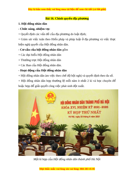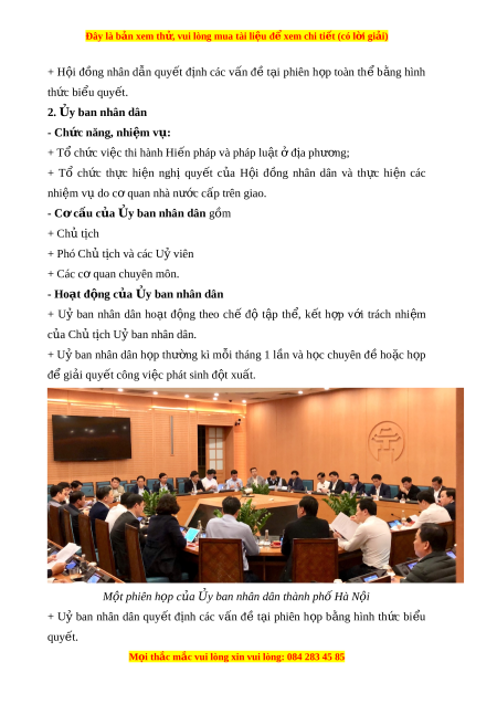 Đây là bản xem th , vu ử i lòng mua tài li u ệ đ xe ể m chi ti t (c ế ó l i ờ gi i ả ) + H i ộ đ ng ồ nhân d n ẫ quy t ế đ nh ị các v n ấ đ ề t i ạ phiên h p ọ toàn th ể b ng ằ hình th c ứ bi u ể quy t ế . 2. y ban nhân d Ủ ân - Ch c nă ứ ng, nhi m ệ v : ụ + Tổ ch c vi ứ c t ệ hi hành Hi n pháp ế và pháp lu t ậ đ ở a ph ị ư ng; ơ + Tổ ch c ứ th c ự hi n ệ nghị quy t ế c a ủ H i ộ đ ng ồ nhân dân và th c ự hi n ệ các nhiệm v do c ụ ơ quan nhà nư c c ớ ấp trên giao. - C c ơ ấu c a ủ y ban n Ủ hân dân gồm + Chủ tịch + Phó Chủ t ch và ị các U vi ỷ ên + Các c quan ơ chuyên môn. - Ho t ạ đ ng c ộ a ủ y ban nhâ Ủ n dân + Uỷ ban nhân dân ho t ạ đ ng ộ theo chế độ t p ậ th , ể k t ế h p ợ v i ớ trách nhi m ệ c a ủ Ch t ủ ịch U ban ỷ nhân dân. + Uỷ ban nhân dân h p ọ thư ng ờ kì m i ỗ tháng 1 l n ầ và h c ọ chuyên đ ề ho c ặ h p ọ đ gi ể i ả quy t ế công vi c phát ệ sinh đ t ộ xu t ấ . M t ộ phiên h p c ọ a ủ y ban nhân dân t Ủ hành phố Hà N i ộ + Uỷ ban nhân dân quy t ế đ nh ị các v n ấ đề t i ạ phiên h p ọ b ng ằ hình th c ứ bi u ể quy t ế . M i ọ thắc m c