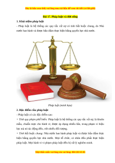 Đây là bản xem th , vu ử i lòng mua tài li u ệ đ xe ể m chi ti t ế (có l i ờ gi i ả ) Bài 17. Pháp lu t ậ và đ i ờ s ng ố 1. Khái ni m ệ pháp lu t ậ - Pháp lu t ậ là hệ th ng ố các quy t c ắ xử sự có tính b t ắ bu c ộ chung, do Nhà nư c ban ớ hành và đư c b ợ o ả đ m ả th c ự hi n b ệ ng ằ quy n l ề c nhà n ự ư c. ớ Pháp lu t ậ (minh h a) ọ 2. Đặc đi m ể c a pháp l ủ u t ậ - Pháp lu t ậ có các đặc đi m ể sau: + Tính quy ph m ạ phổ bi n: ế Pháp lu t ậ là hệ th ng ố các quy t c ắ x ử s , ự là khuôn mẫu, chu n ẩ m c ự cho hành vi; đư c ợ áp d ng ụ nhi u ề l n, ầ trong ph m ạ vi hi u ệ l c m ự à nó tác đ ng ộ đ n, v ế i ớ nhi u đ ề ối tư ng. ợ + Tính b t ắ bu c ộ chung: Nhà nư c ớ ban hành pháp lu t ậ và đư c ợ b o ả đ m ả th c ự hiện b ng ằ quy n ề l c ự nhà nư c. ớ M i ọ tổ ch c, ứ cá nhân đ u ề ph i ả th c ự hi n ệ pháp lu t ậ . M i ọ hành vi vi ph m ạ pháp lu t ậ đ u b ề x ị l ử ý nghiêm minh. M i