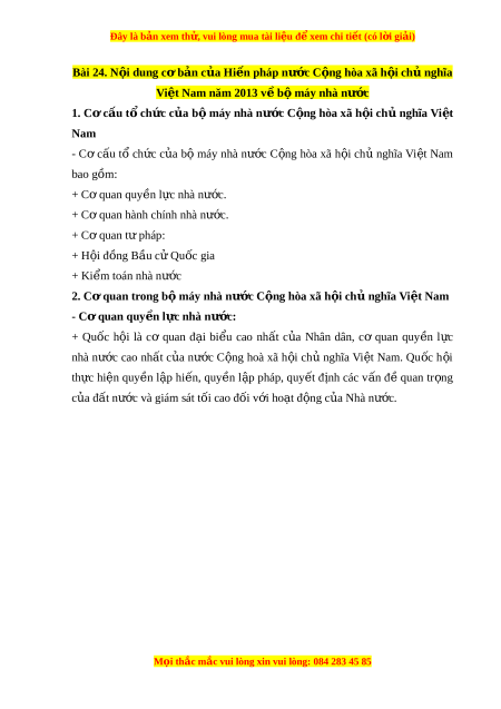 Đây là bản xem th , vu ử i lòng mua tài li u ệ đ xe ể m chi ti t ế (có l i ờ gi i ả ) Bài 24. N i ộ dung cơ b n c ả a H ủ i n p ế háp nư c C ớ ng ộ hòa xã h i ộ ch nghĩ ủ a Vi t ệ Nam năm 2013 v b ề m ộ áy nhà nư c ớ 1. Cơ cấu t ổ ch c ứ c a ủ b ộ máy nhà nư c ớ C ng ộ hòa xã h i ộ ch ủ nghĩa Vi t ệ Nam - Cơ c u ấ tổ ch c ứ c a ủ bộ máy nhà nư c ớ C ng ộ hòa xã h i ộ ch ủ nghĩa Vi t ệ Nam bao gồm: + C quan ơ quy n l ề c nhà n ự ư c. ớ + C quan ơ hành chính nhà nư c. ớ + C quan ơ t pháp: ư + H i ộ đ ng B ồ u c ầ Q ử u c gi ố a + Ki m ể toán nhà nư c ớ 2. C quan t ơ rong b m ộ áy nhà nư c C ớ ng ộ hòa xã h i ộ ch n ủ ghĩa Vi t ệ Nam - Cơ quan quy n l ề c n ự hà nư c: ớ + Qu c ố h i ộ là cơ quan đ i ạ bi u ể cao nh t ấ c a ủ Nhân dân, cơ quan quy n ề l c ự nhà nước cao nh t ấ c a ủ nư c ớ C ng ộ hoà xã h i ộ ch ủ nghĩa Vi t ệ Nam. Qu c ố h i ộ th c ự hi n ệ quy n ề l p ậ hi n, ế quy n ề l p ậ pháp, quy t ế đ nh ị các v n ấ đ ề quan tr ng ọ c a đ ủ ất nư c ớ và giám sát t i ố cao đ i ố v i ớ ho t ạ đ ng ộ c a N ủ hà nư c. ớ M i