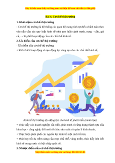 Đây là bản xem th , vu ử i lòng mua tài li u ệ đ xe ể m chi ti t ế (có l i ờ gi i ả ) Bài 4. Cơ ch t ế h t ị rư ng ờ 1. Khái ni m ệ c ch ơ ế th t ị rư ng ờ - Cơ chế thị trư ng ờ là h ệ th ng ố các quan h ệ mang tính t ự đi u ề ch nh ỉ tuân theo yêu c u ầ c a ủ các quy lu t ậ kinh tế như quy lu t ậ c nh ạ tranh, cung - c u, ầ giá c ,... chi ả phối ho t ạ đ ng c ộ a các ủ ch t ủ h ki ể nh t . ế 2. u đ Ư i m ể c a c ủ ơ ch t ế h t ị rư ng ờ - Ưu đi m ể c a ủ c ch ơ ế th t ị rư ng: ờ + Kích thích ho t ạ đ ng ộ và t o đ ạ ng l ộ c ự sáng t o ạ cho các ch t ủ h ki ể nh t ; ế Kinh t t ế h t ị rư ng ờ t o đ ạ ng l ộ c ự cho kinh t phát ế tri n ( ể minh h a) ọ + Thúc đ y ẩ các doanh nghi p ệ c i ả ti n, ế phát minh và ng ứ d ng ụ thành t u ự c a ủ khoa h c - ọ công nghệ, đổi m i ớ tổ ch c ứ s n ả xu t ấ và qu n l ả í kinh doanh; + Th c hi ự n phân ph ệ i ố các ngu n l ồ c ki ự nh t m ế t ộ cách t i ố u; ư + Phát huy t i ố đa ti m ề năng c a ủ m i ọ chủ th , ể vùng mi n, ề thúc đ y ẩ liên k t ế kinh t t ế rong nư c ớ và h i ộ nh p ậ qu c ố t . ế 3. Nhược đi m ể c a c ủ ơ ch t ế h t ị rư ng ờ M i