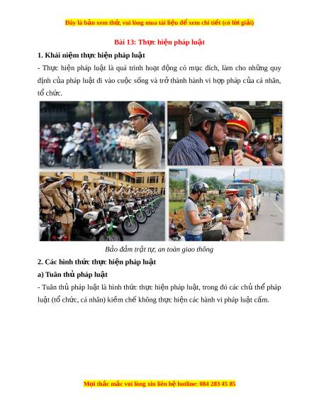 Đây là bản xem th , vu ử i lòng mua tài li u ệ đ xe ể m chi ti t (c ế ó l i ờ gi i ả ) Bài 13: Th c hi ự n p ệ háp lu t ậ 1. Khái ni m ệ th c h ự i n pháp l ệ u t ậ - Th c ự hi n ệ pháp lu t ậ là quá trình ho t ạ đ ng ộ có m c ụ đích, làm cho nh ng ữ quy định c a ủ pháp lu t ậ đi vào cu c ộ s ng ố và tr ở thành hành vi h p ợ pháp c a ủ cá nhân, tổ ch c. ứ B o đ ả m ả tr t ậ t , an t ự oàn giao thông 2. Các hình th c t ứ h c ự hi n pháp l ệ u t ậ a) Tuân th p ủ háp lu t ậ - Tuân thủ pháp lu t ậ là hình th c ứ th c ự hi n ệ pháp lu t ậ , trong đó các ch ủ th ể pháp lu t ậ (tổ ch c, cá ứ nhân) ki m ề chế không th c hi ự n các hành vi ệ pháp lu t ậ c m ấ . M i