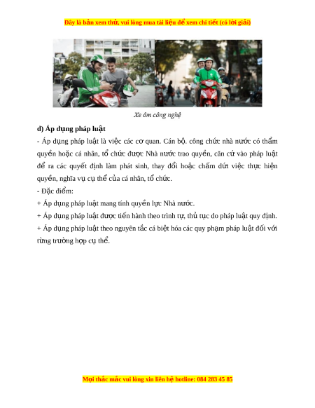 Đây là bản xem th , vu ử i lòng mua tài li u ệ đ xe ể m chi ti t (c ế ó l i ờ gi i ả ) d) Áp d ng pháp l ụ u t ậ - Áp d ng ụ pháp lu t ậ là vi c ệ các cơ quan. Cán b . ộ công ch c ứ nhà nư c ớ có th m ẩ quy n ề ho c ặ cá nhân, tổ ch c ứ đư c ợ Nhà nư c ớ trao quy n, ề căn cứ vào pháp lu t ậ để ra các quy t ế đ nh ị làm phát sinh, thay đ i ổ ho c ặ ch m ấ d t ứ vi c ệ th c ự hi n ệ quy n, nghĩ ề a v c ụ t ụ h c ể a ủ cá nhân, tổ ch c. ứ - Đ c ặ đi m ể : + Áp d ng pháp ụ lu t ậ mang tính quy n l ề c N ự hà nư c. ớ + Áp d ng pháp ụ lu t ậ đư c ợ ti n ế hành theo trình t , t ự h t ủ c ụ do pháp lu t ậ quy đ nh. ị + Áp d ng ụ pháp lu t ậ theo nguyên t c ắ cá bi t ệ hóa các quy ph m ạ pháp lu t ậ đ i ố v i ớ t ng t ừ rư ng h ờ p ợ c t ụ h . ể M i