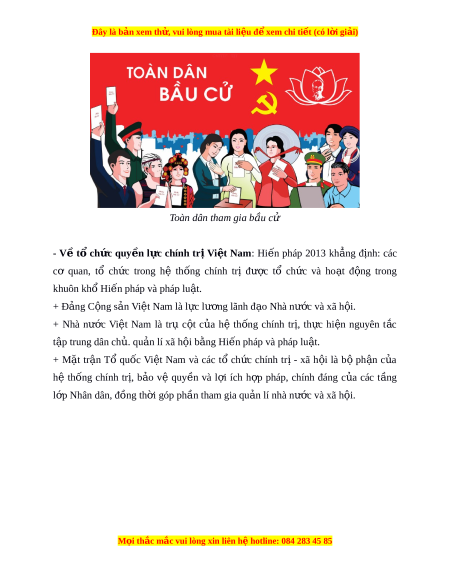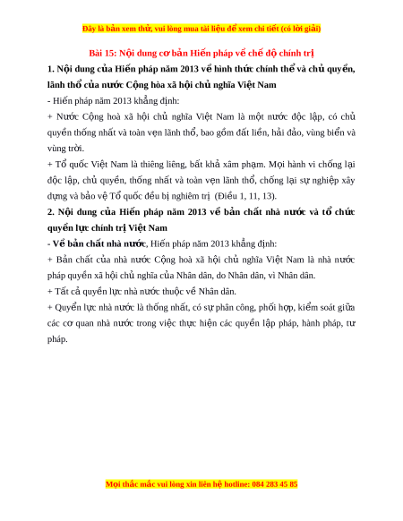 Đây là bản xem th , vu ử i lòng mua tài li u ệ đ xe ể m chi ti t (c ế ó l i ờ gi i ả ) Bài 15: N i ộ dung c b ơ n H ả i n phá ế p v ch ề đ ế chí ộ nh trị 1. N i ộ dung c a ủ Hi n ế pháp năm 2013 v ề hình th c ứ chính th ể và ch ủ quy n, ề lãnh thổ c a n ủ ư c ớ C ng hòa xã h ộ i ộ ch ngh ủ ĩa Vi t ệ Nam - Hi n pháp n ế ăm 2013 khẳng định: + Nư c ớ C ng ộ hoà xã h i ộ chủ nghĩa Vi t ệ Nam là m t ộ nư c ớ đ c ộ l p ậ , có chủ quy n ề th ng ố nh t ấ và toàn v n ẹ lãnh thổ, bao g m ồ đ t ấ li n, ề h i ả đ o, ả vùng biển và vùng tr i ờ . + Tổ qu c ố Vi t
