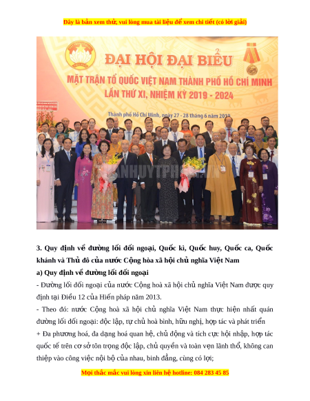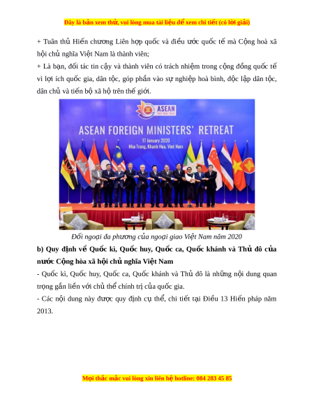 Đây là bản xem th , vu ử i lòng mua tài li u ệ đ xe ể m chi ti t (c ế ó l i ờ gi i ả ) 3. Quy đ nh ị về đư ng ờ l i ố đ i ố ngo i ạ , Qu c ố kì, Qu c ố huy, Qu c ố ca, Qu c ố khánh và Th đô c ủ a n ủ ư c C ớ ng hòa xã h ộ i ộ ch nghĩ ủ a Vi t ệ Nam a) Quy đ nh v ị đ ề ư ng l ờ i ố đ i ố ngo i ạ - Đư ng ờ l i ố đ i ố ngo i ạ c a ủ nư c ớ C ng ộ hoà xã h i ộ chủ nghĩa Vi t ệ Nam đư c ợ quy định t i ạ Đi u ề 12 của Hi n pháp n ế ăm 2013. - Theo đó: nư c ớ C ng ộ hoà xã h i ộ chủ nghĩa Vi t ệ Nam th c ự hi n ệ nh t ấ quán đư ng ờ lối đ i ố ngo i ạ : đ c ộ l p, t ậ ch ự hoà ủ bình, h u ữ ngh , h ị p ợ tác và phát tri n ể + Đa phư ng ơ hoá, đa d ng ạ hoá quan h , ệ ch ủ đ ng ộ và tích c c ự h i ộ nh p, ậ h p ợ tác quốc tế trên c ơ s ở tôn tr ng ọ đ c ộ l p, ậ ch ủ quy n ề và toàn v n ẹ lãnh th , ổ không can thi p vào công vi ệ c n ệ i ộ bộ c a nhau, bi ủ nh đ ng, ẳ cùng có l i ợ ; M i