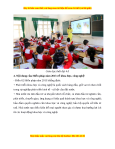 Đây là bản xem th , vu ử i lòng mua tài li u ệ đ xe ể m chi ti t (c ế ó l i ờ gi i ả ) Giáo d c t ụ h i ờ đ i ạ 4.0 4. N i ộ dung c a H ủ i n phá ế p năm 2013 v khoa h ề c, công ngh ọ ệ - Điều 62 Hi n pháp n ế ăm 2013 khẳng định: + Phát tri n ể khoa h c ọ và công ngh ệ là qu c ố sách hàng đ u, ầ gi ữ vai trò then ch t ố trong s nghi ự p phát ệ tri n ki ể nh t - ế xã h i ộ c a đ ủ t ấ nư c. ớ + Nhà nư c ớ u ư tiên đ u ầ t ư và khuy n ế khích t ổ ch c, ứ cá nhân đ u ầ t ư nghiên c u, ứ phát tri n, ể chuy n ể giao, ng ứ d ng ụ có hi u ệ qu ả thành t u ự khoa h c ọ và công nghệ; b o ả đ m ả quy n ề nghiên c u ứ khoa h c ọ và công ngh ; ệ b o ả hộ quy n ề sở h u ữ trí tuệ. Nhà nư c ớ t o ạ đi u ề ki n ệ để m i ọ ngư i ờ tham gia và đư c ợ th ụ hư ng ở l i ợ ích t các ừ ho t ạ đ ng ộ khoa h c và công ngh ọ . ệ M i