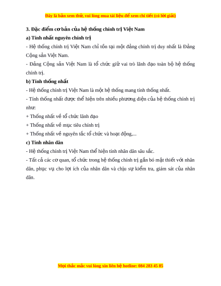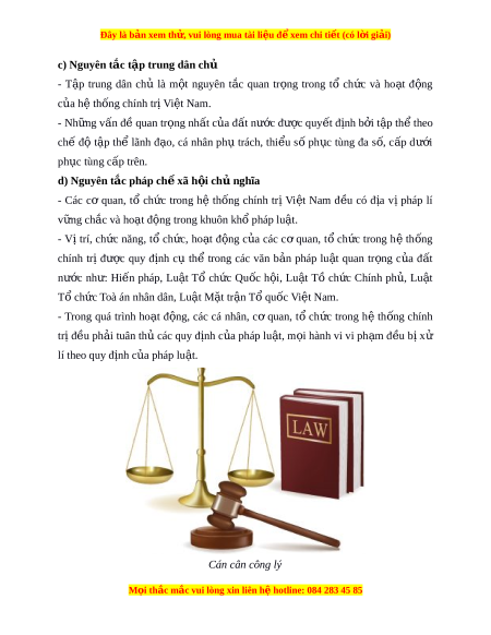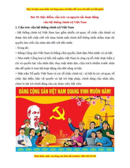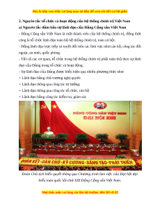 Đây là bản xem th , vu ử i lòng mua tài li u ệ đ xe ể m chi ti t (c ế ó l i ờ gi i ả ) 2. Nguyên t c t ắ ch ổ c ứ và ho t ạ đ ng c ộ a h ủ t ệ h ng chí ố nh tr ị Vi t ệ Nam a) Nguyên t c đ ắ m ả b o s ả l ự ãnh đ o c ạ a Đ ủ ng C ả ng s ộ n ả Vi t ệ Nam - Đ ng ả C ng ộ s n ả Vi t ệ Nam là m t ộ thành viên c a ủ h ệ th ng ố chính tr ,ị đ ng ồ th i ờ cũng là tổ ch c ứ lãnh đ o t ạ oàn bộ h t ệ hống chính tr , t ị oàn xã h i ộ . - Đ ng ả lãnh đ o ạ tr c ự ti p ế và tuy t ệ đ i ố trên các lĩnh v c ự nh ư cán b , ộ công tác đ i ố ngo i ạ , an ninh, qu c ố phòng. - Tất cả các c ơ quan, tổ ch c ứ trong h ệ th ng ố chính tr ịph i ả tuân th ủ theo s ự lãnh đ o ạ c a Đ ủ ng ả trong t ch ổ c và ứ ho t ạ đ ng. ộ - S l ự ãnh đ o c ạ a ủ Đ ng ả đư c bi ợ u hi ể n qua nhi ệ u ph ề ư ng ơ th c nh ứ : ư + Lãnh đ o b ạ ng ằ ch t ủ rư ng ngh ơ quy ị t ế : + Lãnh đ o t ạ hông qua công tác t t ư ư ng; ở + Lãnh đ o t ạ hông qua công tác t ch ổ c, ứ cán bộ + Lãnh đ o b ạ ng ằ công tác ki m ể tra, giám sát.