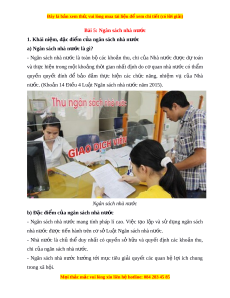 a) Ngân sách nhà nư c l ớ à gì? - Ngân sách nhà nư c ớ là toàn bộ các kho n ả thu, chi c a ủ Nhà nư c ớ đư c ợ dự toán và th c ự hi n ệ trong m t ộ kho ng ả th i ờ gian nh t ấ đ nh do ị c ơ quan nhà nư c ớ có th m ẩ quy n ề quy t ế đính để b o ả đ m ả th c ự hi n ệ các ch c ứ năng, nhi m ệ vụ c a ủ Nhà nư c. ở (Kho n ả 14 Đi u ề 4 Lu t ậ Ngân sách nhà nư c ớ năm 2015). Ngân sách nhà nư c ớ b) Đặc đi m ể c a ngân s ủ ách nhà nư c ớ - Ngân sách nhà nư c