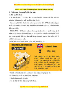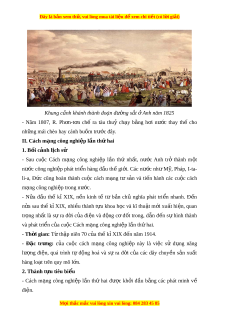 II. Cách mạng công nghi p l ệ n t ầ h ha ứ i 1. B i ố cảnh l ch s ị ử - Sau cu c ộ Cách m ng ạ công nghi p ệ l n ầ thứ nh t ấ , nư c ớ Anh trở thành m t ộ nư c ớ công nghi p ệ phát tri n ể hàng đ u ầ th ế gi i ớ . Các nư c ớ nh ư M , ỹ Pháp, I-ta- li-a, Đ c ứ cũng hoàn thành cu c ộ cách m ng ạ tư s n ả và ti n ế hành các cu c ộ cách m ng ạ công nghi p t ệ rong nư c. ớ - N a ử đ u ầ thế kỉ XIX, n n ề kinh tế tư b n ả chủ nghĩa phát tri n ể nhanh. Đ n ế n a ử sau thế k ỉXIX, nhi u ề thành t u ự khoa h c ọ và kĩ thu t ậ m i ớ xu t ấ hi n, ệ quan tr ng ọ nh t ấ là sự ra đ i ờ c a ủ đi n ệ và đ ng ộ c ơ đ t ố trong, d n ẫ đ n ế s ự hình thành và phát tri n c ể a ủ cu c C ộ ách m ng công ạ nghi p l ệ n t ầ h hai ứ . - Th i ờ gian: T t ừ h p ậ niên 70 c a t ủ hế kỉ XIX đ n năm ế 1914. - Đ c ặ tr ng: ư c a ủ cu c ộ cách m ng ạ công nghi p ệ này là vi c ệ sử d ng ụ năng lư ng ợ đi n, ệ quá trình tự đ ng ộ hoá và sự ra đ i ờ c a ủ các dây chuy n ề s n ả xu t ấ hàng lo t ạ trên quy mô l n. ớ 2. Thành t u t ự iêu bi u ể - Cách m ng ạ công nghi p ệ l n ầ thứ hai đư c ợ kh i ở đ u ầ b ng ằ các phát minh về điện. M i ọ thắc m c