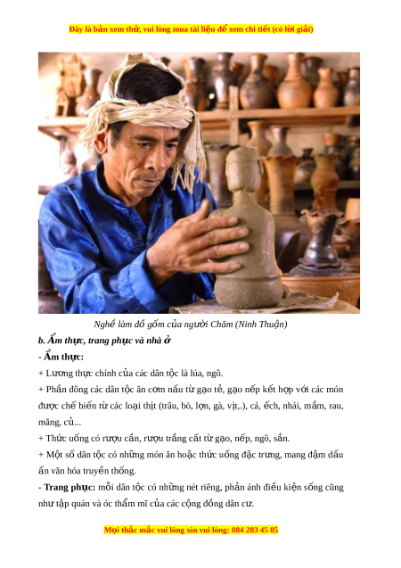 Nghề làm đồ gốm c a ủ ngư i ờ Chăm (Ninh Thu n) ậ b. Ẩm th c, t ự rang ph c và ụ nhà ở - m Ẩ th c: ự + Lư ng t ơ h c chí ự nh c a ủ các dân t c l ộ à lúa, ngô. + Ph n ầ đông các dân t c ộ ăn c m ơ n u ấ t ừ g o ạ t , ẻ g o ạ n p ế k t ế h p ợ v i ớ các món đư c ợ chế bi n ế t ừ các lo i ạ th t ị (trâu, bò, l n, ợ gà, v tị,.), cá, ch, ế nhái, m m ắ , rau, măng, c ... ủ + Th c ứ u ng có r ố ư u c ợ n, r ầ ư u t ợ r ng c ắ t ấ t g ừ o, ạ n p, ngô, s ế n. ắ + M t ộ số dân t c ộ có nh ng ữ món ăn ho c ặ th c ứ u ng ố đ c ặ tr ng, ư mang đ m ậ d u ấ ấn văn hóa truy n t ề hống. - Trang ph c: ụ mỗi dân t c ộ có nh ng ữ nét riêng, ph n ả ánh đi u ề ki n ệ s ng ố cũng nh t ư p ậ quán và óc th m ẩ mĩ c a các ủ c ng đ ộ ng dân c ồ . ư M i ọ thắc m c