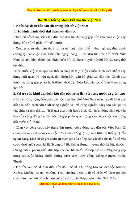 Đây là bản xem th , vu ử i lòng mua tài li u ệ đ xe ể m chi ti t ế (có l i ờ gi i ả ) Bài 20. Kh i ố đ i ạ đoàn k t ế dân t c ộ Vi t ệ Nam I. Kh i ố đ i ạ đoàn k t ế dân t c t ộ rong l ch s ị ử Vi t ệ Nam