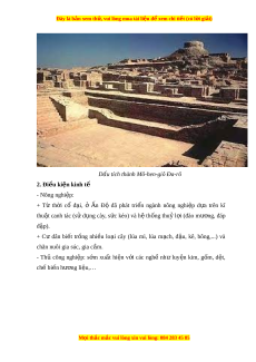 Dấu tích thành Mô-hen-giô Đa-rô 2. Đi u k ề i n ki ệ nh tế - Nông nghiệp: + Từ th i ờ cổ đ i ạ , ở n Ấ Độ đã phát tri n ể ngành nông nghi p ệ d a ự trên kĩ thu t ậ canh tác (s ử d ng ụ cày, s c ứ kéo) và h ệ th ng ố thu ỷ l i ợ (đào mư ng, ơ đáp đ p) ậ . + Cư dân bi t ế tr ng ồ nhi u ề lo i ạ cây (lúa mì, lúa m ch, ạ đ u, ậ kê, bông,...) và chăn nuôi gia súc, gia c m ầ . - Thủ công nghi p: ệ s m ớ xu t ấ hi n ệ v i ớ các nghề như luy n ệ kim, g m ố , d t ệ , ch bi ế n h ế ư ng ơ li u,… ệ M i
