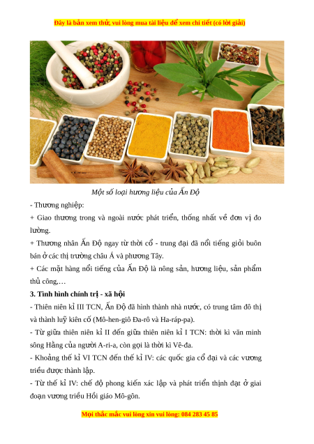Đây là bản xem th , vu ử i lòng mua tài li u ệ đ xe ể m chi ti t (c ế ó l i ờ gi i ả ) M t ộ số lo i ạ hư ng l ơ i u c ệ a ủ n Đ Ấ ộ - Thư ng nghi ơ p: ệ + Giao thư ng ơ trong và ngoài nư c ớ phát tri n, ể th ng ố nh t ấ về đ n ơ vị đo lư ng. ờ + Thư ng ơ nhân n Ấ Độ ngay từ th i ờ cổ - trung đ i ạ đã n i ổ ti ng ế gi i ỏ buôn bán ở các thị trư ng ờ châu Á và phư ng ơ Tây. + Các m t ặ hàng n i ổ ti ng ế c a ủ n Ấ Độ là nông s n, ả hư ng ơ li u, ệ s n ả ph m ẩ th công,… ủ