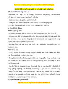 - Văn minh Văn Lang - Âu L c ạ (còn g i ọ là văn minh sông H ng, ồ văn minh Vi t ệ cổ, văn minh Đông S n) ơ có ngu n g ồ c ố b n đ ả a ị - Ch nhân ủ là các c ng ộ đ ng ng ồ ư i ờ Vi t ệ cổ - Th i ờ gian: đ u t ầ hiên niên k I ỉ TCN đ n vài ế th k ế đ ỉ u C ầ ng nguyên ố - Địa bàn: khu v c B ự c B ắ và B ộ c ắ Trung Bộ Vi t ệ Nam ngày nay. a) C s ơ hì ở nh thành * Đi u ki ề n t ệ nhi ự ên - Hình thành trên l u v ư c các ự dòng sông nh s ư ông H ng, s ồ ông Mã, sông C ,... ả - Khu v c ự này đ t ấ đai màu m , ỡ hệ th ng ố sông ngòi dày đ c, ặ khí h u ậ nhi t ệ đ i ớ ẩm gió mùa,... thu n ậ l i ợ cho đ ng ộ v t ậ , th c ự v t ậ sinh sôi, n y ả n , ở phát tri n ể nông nghiệp, đ c ặ bi t ệ là nghề tr ng l ồ úa nư c ớ - Khoáng s n ả có các mỏ đ ng, ồ s t ắ , thi c, ế chì,... thu n ậ l i ợ cho nghề luy n ệ kim phát tri n s ể m ớ . * Cơ sở xã h i ộ - Có c i ộ ngu n