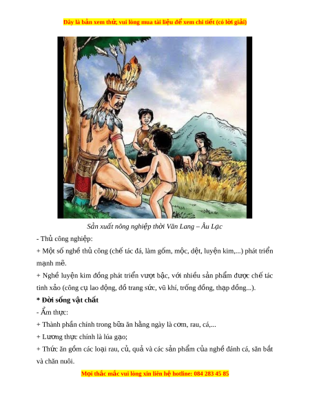 ờ Văn Lang – Âu L c ạ - Th công nghi ủ p: ệ + M t ộ số ngh t ề h công ( ủ ch t ế ác đá, làm g m ố , m c, ộ d t ệ , luy n ki ệ m,...) phát tri n ể m nh ạ m . ẽ + Nghề luy n ệ kim đ ng ồ phát tri n ể vư t ợ b c, ậ v i ớ nhi u ề s n ả ph m ẩ đư c ợ ch ế tác tinh x o ả (công cụ lao đ ng, đ ộ ồ trang s c, vũ khí ứ , tr ng đ ố ng, t ồ h p đ ạ ng...) ồ . * Đ i ờ s ng v ố ật ch t ấ - m Ẩ th c: ự + Thành ph n chí ầ nh trong b a ăn h ữ ng ằ ngày là c m ơ , rau, cá,... + Lư ng t ơ h c chí ự nh là lúa g o; ạ + Th c ứ ăn g m ồ các lo i ạ rau, c , ủ qu ả và các s n ả ph m ẩ c a ủ ngh ề đánh cá, săn b t ắ và chăn nuôi. M i
