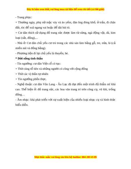Đây là bản xem th , vu ử i lòng mua tài li u ệ đ xe ể m chi ti t (c ế ó l i ờ gi i ả ) - Trang ph c: ụ + Thư ng ờ ngày, phụ nữ m c ặ váy và áo y m ế , đàn ông đóng kh , ố ở tr n, ầ đi chân đất, tóc đ xoã ngang ể vai ho c đ ặ dài ể búi tó. + Cư dân thích sử d ng ụ đồ trang s c ứ đư c ợ làm từ s ng, ừ ngà đ ng ộ v t ậ , đá, kim lo i ạ (s t ắ , đồng),... - Nhà : ở Cư dân chủ y u