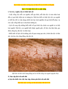 I. Vai trò, ý nghĩa c a t ủ ri th c l ứ ch s ị ử - Cu c ộ s ng ố c a ủ m i ỗ con ngư i ờ , m i ỗ gia đình, m i ỗ dân t c ộ và toàn nhân lo i ạ đ u ề có quá kh , ứ hi n ệ t i ạ và tư ng ơ lai. Nhờ tìm hi u ể tri th c ứ l ch ị s , ử con ngư i ờ có thể đúc k t ế và v n ậ d ng ụ nhi u ề bài h c ọ kinh nghi m ệ t ừ quá kh ứ đ ể ph c ụ vụ cho cuộc sống hiện t i ạ và dự đoán tư ng l ơ ai. - L ch ị sử cung c p ấ nh ng ữ hi u ể bi t ế về quá khứ c a ủ chính con ngư i ờ và xã h i ộ loài ngư i ờ . Nhờ đó, con ngư i ờ bi t ế đư c ợ ngu n ồ g c, ố tổ tiên c a ủ b n ả thân, gia đình, dòng h , dân ọ t c và nhân l ộ o i ạ . - Hi u ể bi t ế v ề l ch ị s ử là nh ng ữ y u ế t ố quan tr ng ọ t o ạ nên ý th c ứ dân t c ộ và b n ả s c văn ắ hóa c a c ủ ng ộ đồng, dân t c đó. ộ II. H c ọ tập l ch s ị s ử u t ố đ i ờ a) Sự cần thi t ế c a vi ủ c h ệ c ọ t p, khá ậ m phá l ch s ị s ử u t ố đ i ờ M i