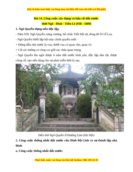 ớ vua có quan văn, quan võ. + Cử các tư ng ớ có công coi gi các ữ châu quan tr ng. ọ - Ngô Quy n ề lên ngôi đư c ợ 6 năm đ t ấ nư c ớ bình yên, đ c ộ l p ậ dân t c ộ đư c ợ c ng ủ cố, t o ạ n n t ề ng cho ả s phát ự tri n t ể h i ờ kì sau. Đ n ề thờ Ngô Quy n ề Đ ở ư ng Lâm ờ (Hà N i ộ ) 2. Công cu c ộ th ng ố nh t ấ đ t ấ nư c ớ c a