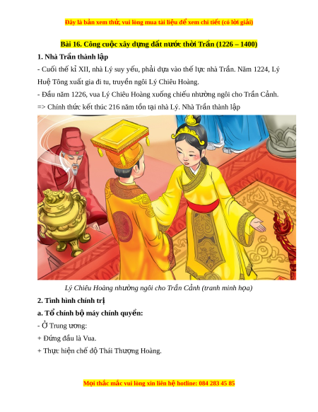 Đây là bản xem th , vu ử i lòng mua tài li u ệ đ xe ể m chi ti t (c ế ó l i ờ gi i ả ) Bài 16. Công cu c ộ xây d ng đ ự t ấ nư c t ớ h i ờ Tr n ( ầ 1226 – 1400) 1. Nhà Tr n t ầ hành l p ậ - Cu i ố th