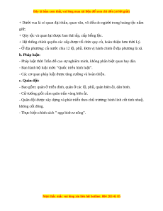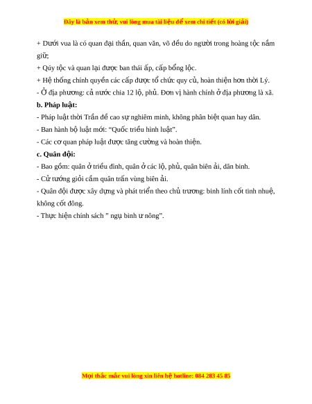 Đây là bản xem th , vu ử i lòng mua tài li u ệ đ xe ể m chi ti t (c ế ó l i ờ gi i ả ) + Dư i ớ vua là có quan đ i ạ th n, ầ quan văn, võ đ u ề do ngư i ờ trong hoàng t c ộ n m ắ gi ; ữ + Qúy t c ộ và quan l i ạ đư c ợ ban thái p, c ấ p b ấ ng l ổ c. ộ + H t ệ hống chính quy n các c ề p đ ấ ư c ợ t ch ổ c quy c ứ , hoàn ủ thi n h ệ n t ơ h i ờ Lý. - Ở địa phư ng: ơ cả nư c chi ớ a 12 l , ộ ph . Đ ủ n v ơ hành chí ị nh đ ở a ph ị ư ng ơ là xã. b. Pháp lu t ậ : - Pháp lu t ậ th i ờ Tr n đ ầ cao s ề