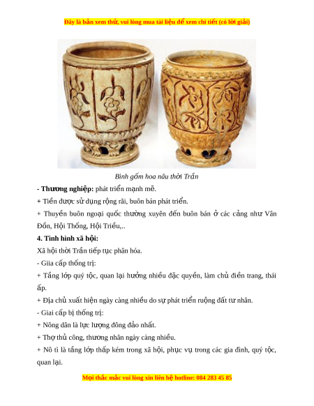 Bình gốm hoa nâu th i ờ Tr n ầ - Thư ng ơ nghi p: ệ phát tri n m ể nh ạ m . ẽ + Ti n đ ề ư c ợ s d ử ng r ụ ng r ộ ãi, buôn bán phát tri n. ể + Thuy n ề buôn ngo i ạ qu c ố thư ng ờ xuyên đ n ế buôn bán ở các c ng ả như Vân Đồn, H i ộ Thống, H i ộ Tri u,.. ề 4. Tình hình xã h i ộ : Xã h i ộ th i ờ Tr n t ầ i p t ế c phân ụ hóa. - Giia c p t ấ h ng t ố r : ị + T ng ầ l p ớ quý t c, ộ quan l i ạ hư ng ở nhi u ề đ c ặ quy n, ề làm chủ đi n ề trang, thái ấp.