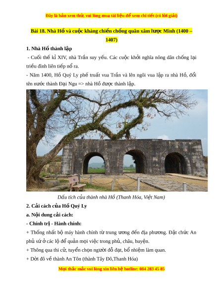 Đây là bản xem th , vu ử i lòng mua tài li u ệ đ xe ể m chi ti t (c ế ó l i ờ gi i ả ) Bài 18. Nhà H và cu ồ c kháng chi ộ n ch ế ng quân xâ ố m lư c Mi ợ nh (1400 – 1407) 1. Nhà Hồ thành l p ậ