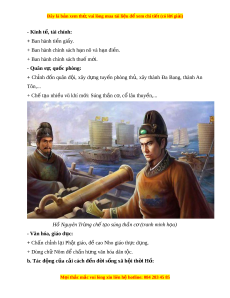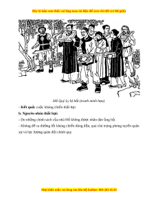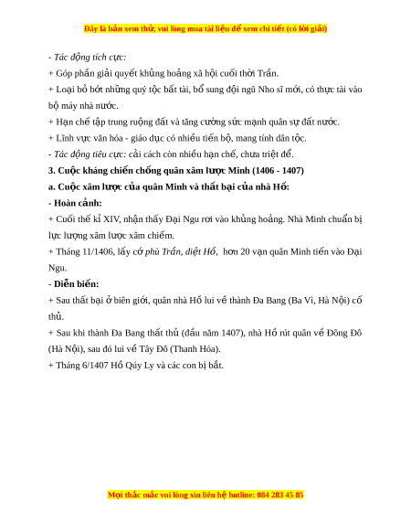 Đây là bản xem th , vu ử i lòng mua tài li u ệ đ xe ể m chi ti t (c ế ó l i ờ gi i ả ) - Tác đ ng t ộ ích c c: ự + Góp ph n ầ gi i ả quy t ế kh ng ho ủ ng xã ả h i ộ cu i ố th i ờ Tr n. ầ + Lo i ạ b ỏ b t ớ nh ng quý ữ t c ộ b t ấ tài, b s ổ ung đ i ộ ngũ Nho sĩ m i ớ , có th c ự tài vào bộ máy nhà nư c. ớ + H n ạ ch t ế p ậ trung ru ng đ ộ t ấ và tăng cư ng s ờ c m ứ nh ạ quân s đ ự t ấ nư c. ớ + Lĩnh v c văn hóa - ự giáo d c có nhi ụ u ề ti n ế b , m ộ ang tính dân t c. ộ - Tác đ ng t ộ iêu c c: ự c i ả cách còn nhi u ề h n ch ạ , ch ế a ư tri t ệ đ . ể 3. Cu c ộ kháng chi n ch ế ng quân xâ ố m lư c ợ Minh (1406 - 1407) a. Cu c ộ xâm lư c ợ c a q ủ uân Minh và th t ấ b i ạ c a nhà H ủ : ồ - Hoàn c nh: ả + Cuối th k ế X ỉ IV, nh n t ậ h y Đ ấ i ạ Ngu r i ơ vào kh ng ủ ho ng. N ả hà Minh chu n b ẩ ị l c ự lư ng xâm ợ lư c xâm ợ chi m ế . + Tháng 11/1406, l y ấ c ớ phù Trần, di t ệ Hồ, h n ơ 20 v n ạ quân Minh ti n ế vào Đ i ạ Ngu. - Di n b ễ i n: ế + Sau th t ấ b i ạ ở biên gi i ớ , quân nhà H ồ lui v