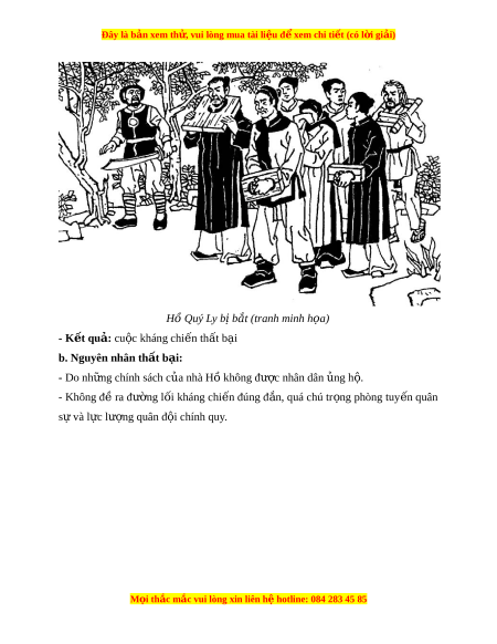 Đây là bản xem th , vu ử i lòng mua tài li u ệ đ xe ể m chi ti t (c ế ó l i ờ gi i ả ) Hồ Quý Ly bị b t ắ (tranh minh h a) ọ - K t ế qu : ả cu c ộ kháng chi n t ế hất b i ạ b. Nguyên nhân th t ấ b i ạ : - Do nh ng chí ữ nh sách c a nhà ủ Hồ không đư c ợ nhân dân ng h ủ . ộ - Không đề ra đư ng ờ l i ố kháng chi n ế đúng đ n, ắ quá chú tr ng ọ phòng tuy n ế quân sự và l c l ự ư ng ợ quân đ i ộ chính quy. M i
