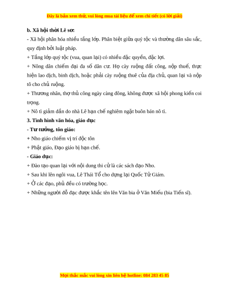 Đây là bản xem th , vu ử i lòng mua tài li u ệ đ xe ể m chi ti t (c ế ó l i ờ gi i ả ) b. Xã h i ộ th i ờ Lê s : ơ - Xã h i ộ phân hóa nhi u ề t ng ầ l p. ớ Phân bi t ệ gi a ữ quý t c ộ và thư ng ờ dân sâu s c, ắ quy định b i ở lu t ậ pháp. + T ng l ầ p quý t ớ c ( ộ vua, quan l i ạ ) có nhi u ề đ c quy ặ n, đ ề c l ặ i ợ . + Nông dân chi m ế đ i ạ đa số dân c . ư Họ cày ru ng ộ đ t ấ công, n p ộ thu , ế th c ự hiện lao d ch, ị binh d ch, ị ho c ặ ph i ả cày ru ng ộ thuê c a ủ đ a ị ch , ủ quan l i ạ và n p ộ tô cho chủ ru ng. ộ + Thư ng ơ nhân, th ợ th