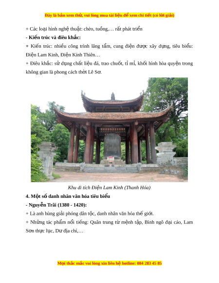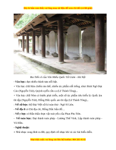 Đây là bản xem th , vu ử i lòng mua tài li u ệ đ xe ể m chi ti t (c ế ó l i ờ gi i ả ) Bia Ti n s ế ĩ c a V ủ ăn Mi u Q ế u c T ố G ử iám - Hà N i ộ - Văn h c: ọ đ t ạ nhi u t ề hành t u n ự ổi b t ậ . + Văn h c ch ọ ữ Hán chi m ế u t ư h , nhi ế u t ề ác ph m ẩ n i ổ ti ng, nh ế : ư Bình Ngô Đ i ạ Cáo (Nguy n ễ Trãi), Quỳnh uy n c ể u ử ca (Lê Thánh Tông),.. + Văn h c ọ chữ Nôm có bư c ớ phát tri n, ể m t ộ s ố tác ph m ẩ tiêu bi u ể là: Qu c ố âm thi t p ậ (Nguy n ễ Trãi), H ng Đ ồ c ứ qu c am ố thi t p ( ậ Lê Thánh Tông),.. - Về s h ử c: ọ b Đ ộ i ạ Việt s kí ử toàn th - ư Ngô Sĩ Liên. - Về đ a l