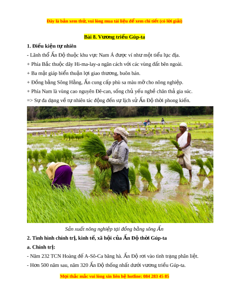 Đây là bản xem th , vu ử i lòng mua tài li u ệ đ xe ể m chi ti t (c ế ó l i ờ gi i ả ) - Đầu th k ế ỉVI, Ngư i ờ Hung Nô và t c ộ ngư i ờ ở Trung Á xâm lư c ợ B c ắ n. Ấ - Năm 535 Vư ng qu ơ ốc Gúp-ta b chi ị a nh và k ỏ t ế thúc. b. Kinh t : ế - Ph n l ầ n ớ ngư i ờ dân nông t ở hôn s ng b ố ng ằ ngh nông. ề - Thư ng ơ m i ạ phát tri n