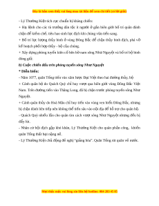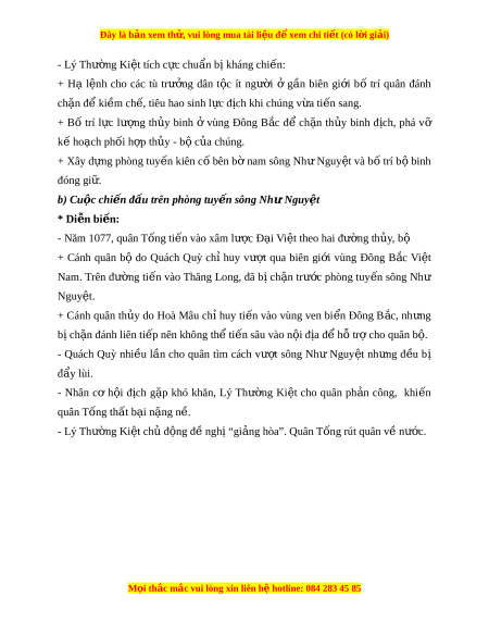 Đây là bản xem th , vu ử i lòng mua tài li u ệ đ xe ể m chi ti t (c ế ó l i ờ gi i ả ) - Lý Thư ng ờ Ki t ệ tích c c chu ự n b ẩ kháng chi ị n: ế + Hạ l nh ệ cho các tù trư ng ở dân t c ộ ít ngư i ờ ở g n ầ biên gi i ớ bố trí quân đánh ch n ặ đ ki ể m ề ch , t ế iêu hao sinh l c đ ự ch khi ị chúng v a ừ ti n ế sang. + Bố trí l c ự lư ng ợ th y ủ binh ở vùng Đông B c ắ để ch n ặ th y ủ binh đ ch, ị phá vỡ k ho ế ạch phối h p t ợ h y - ủ b c ộ a chúng. ủ + Xây d ng ự phòng tuy n ế kiên c ố bên b ờ nam sông Nh ư Nguy t ệ và b ố trí b ộ binh đóng gi . ữ b) Cu c ộ chi n đ ế u t